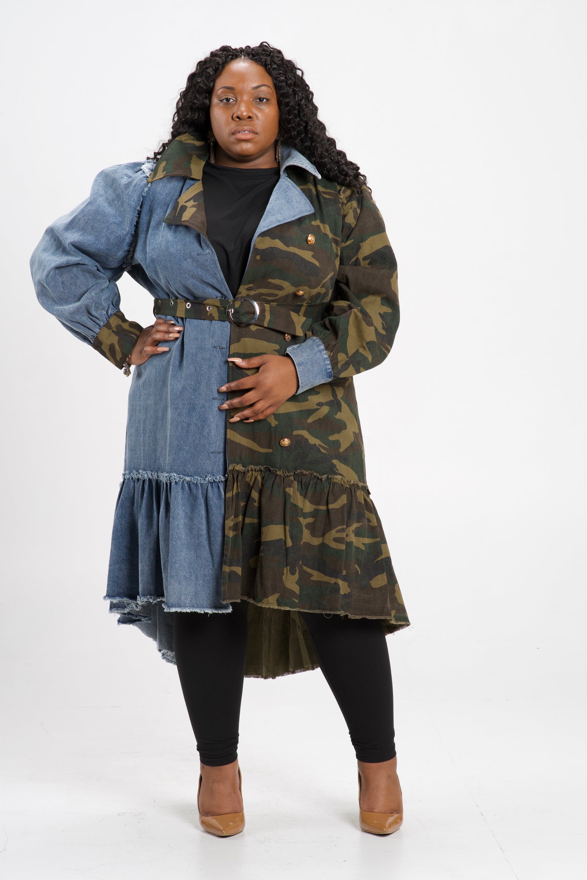 Denim and Camouflage Jacket with Belt
