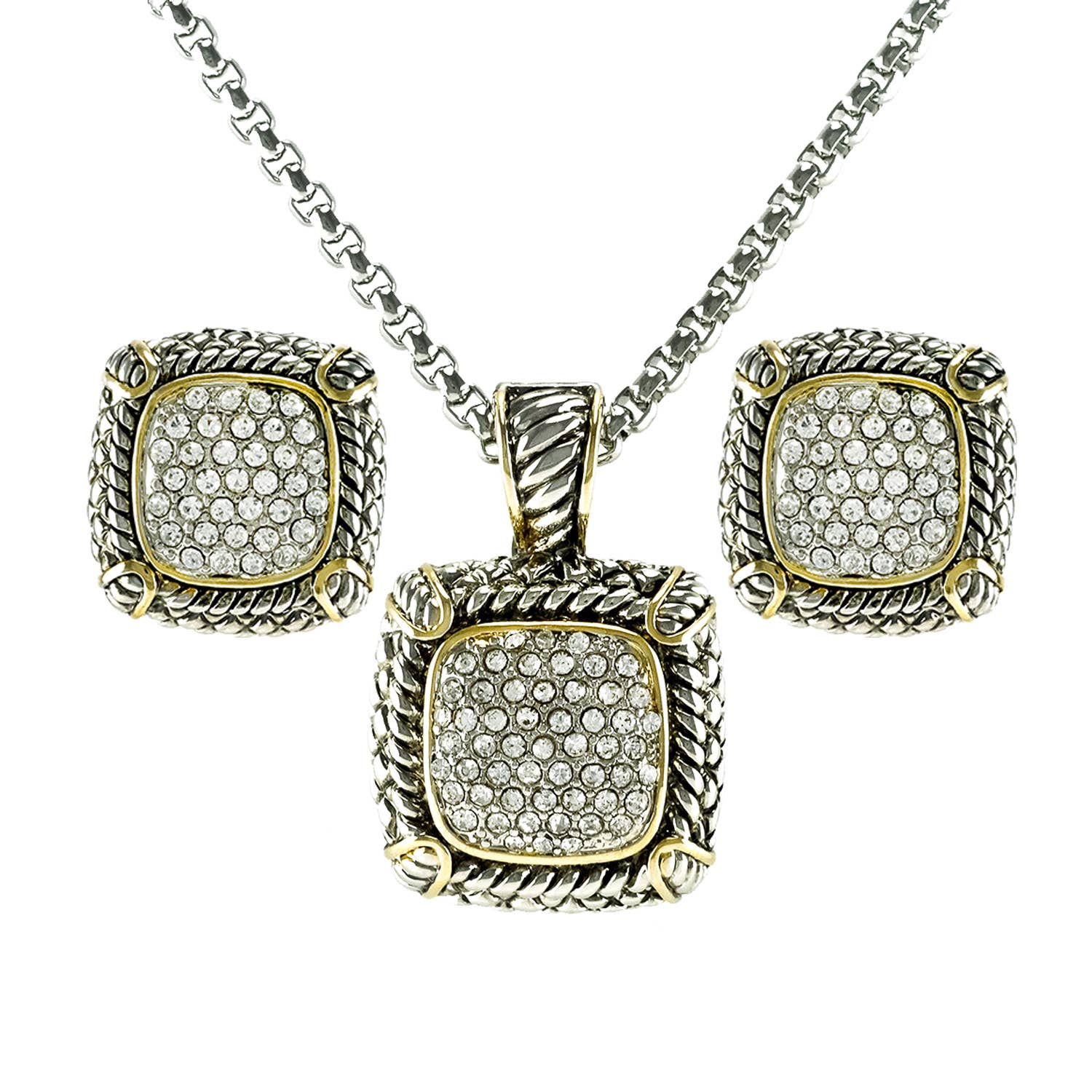 Two Tone Textured Square Crystal Pave Necklace & Earring Set