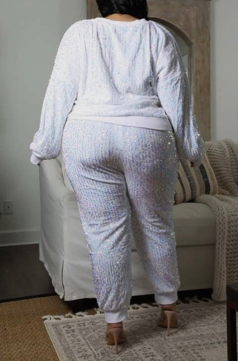 Sequin jogger two piece set, stretch fabric, Long sleeve top, Round neck, High waist pants, No closure.